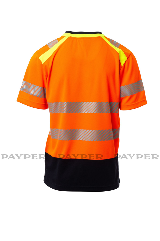 T-Shirt, kurzärmelig, zweifarbig, V-Ausschnitt, hohe Sichtbarkeit. Feinripp-Kragen in Kontrastfarbe, verdeckte Nähte. Segmentierte, heißversiegelte Reflexstreifen auf Schultern, Ärmeln und Taille für eine gute Bewegungsfreiheit. Verstärkungsband in Kontrastfarbe. Seitenschlitze.