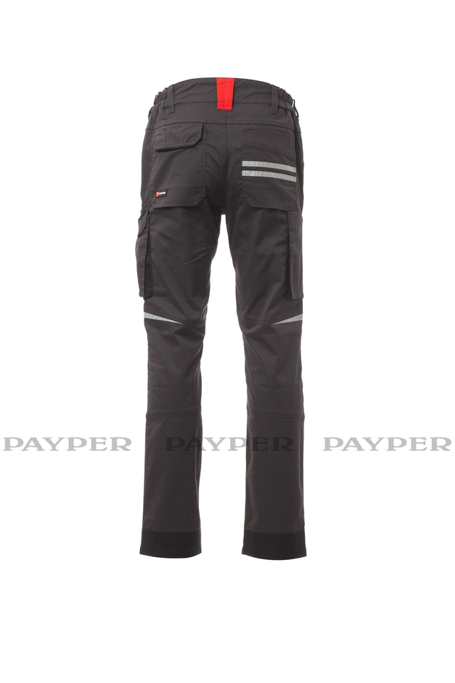 Ganzjährig tragbare 4-Way-Stretch-Unisex-Hose, seitlicher Gummizug und Gürtelschlaufen, Hosenschlitz mit Reißverschluss und personalisierter Knopf. Auf der Vorderseite 2 abgerundete Taschen, 1 Münztäschchen auf der rechten Seite und 1 Sicherheitstasche mit Reißverschluss auf der linken Seite. Auf der Vorderseite des linken Beins befinden sich 3 Taschen: 1 waagrechte Tasche mit Reißverschluss, 1 Tasche mit geformter Patte, Klettverschluss und Ausweisfach, 1 kleine senkrechte Tasche mit Reißverschluss. Reflexstreifen auf der Vorderseite des rechten Beins (mit Ausnahme der Farbvariante Schwarz). Beide Beine sind mit Kniepolstertaschen aus Nylon Oxford 500D mit Öffnung von oben ausgestattet. Rückseite: 1 Tasche mit Patte und Klettverschluss, 1 Hammerschlaufe, 1 offene Zollstocktasche und 1 Smartphonetasche mit Patte und Klettverschluss (rechtes Bein); 1 offene Tasche mit zwei Reflexstreifen (linkes Bein);